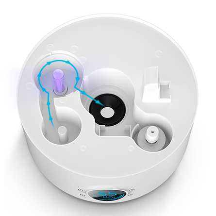 Непосредственно перед ультразвуковым мелкодисперсионным распылением, вода из резервуара проходит дополнительную очистку ультрафиолетовой лампой. Никаких микробов или спор плесени в воздухе!